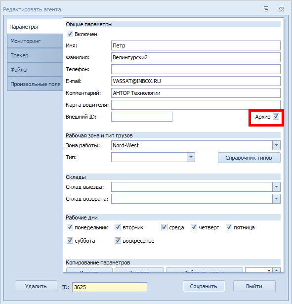 Начиная с версии 2.8.35.23242, в программу добавлен статус агента - "Архивный". Данный статус присваивается агенту при установке чекбокса в поле "Архив" таблицы "Агенты" или в диалоге "Редакировать агента". Агенты со статусом "Архивный" не отображаются в таблице "Агенты" в режиме "Логистика", но остаются в системе и доступны для дальнейшей работы. Для отмены статуса "Архивный" достаточно снять чекбокс в поле "Архив" в диалоге "Редактировать агента".