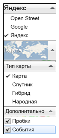 В правой части находится выпадающий список, позволяющий выбрать источник картографических сервисов - Google, Яндекс или Open Street, и тип карты - схема, спутник, или гибрид. По умолчанию используется безплатный сервис OpenStreet. В случае выбора в качестве источника карт Google или Яндекс карт, появляются дополнительные возможности отслеживания на карте трафика движения.