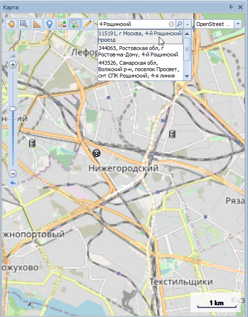 В средней части расположено поле ввода текста для поиска. Поиск запускается нажатием клавиши «Enter» в этом поле либо нажатием соответствующей кнопки в левой части поля. Если поиск успешен, под этим текстовым полем выводится выпадающий список результатов поиска, которых в общем случае может быть несколько. Список можно пролистывать. Двойной щелчок на элементе списка позиционирует карту в соответствующую точку, при этом к точке привязывается описание найденного результата, как показано на рисунке ниже.