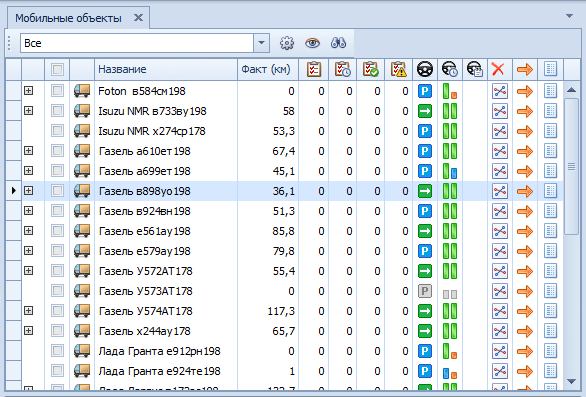Окно «Мобильные объекты» отображает рабочий список объектов мониторинга, их текущее состояние, а также дает быстрый доступ к основным функциям, связанным со мониторингом.