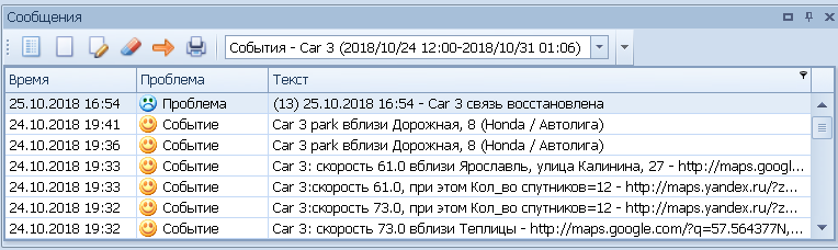 Различные типы событий могут быть могут отображаться в таблице Сообщений, в виде всплывающих окон у оператора, а так же могут быть зарегистрированы на сервере . Так отслеживается например посещение зон, нарушение скорости, тревоги, параметры, значения датчиков, потеря и восстановление связи, простой, изменение статуса задач и прочее.