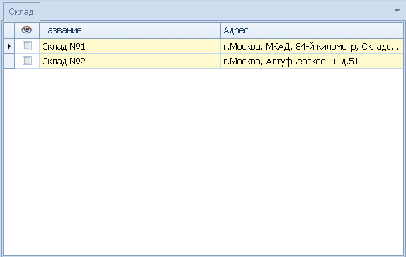 Откроется таблица со списком доступных складов в выбранном офисе. Возможно, она будет пустая, и вам надо будет создать новый склад.
