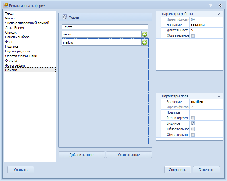 Для создания данного поля выбрать тип поля "Ссылка" в списке доступных и нажать кнопку "Добавить поле" . При этом активируется окно "Параметры поля", а в окне "Форма" появится указанное поле.